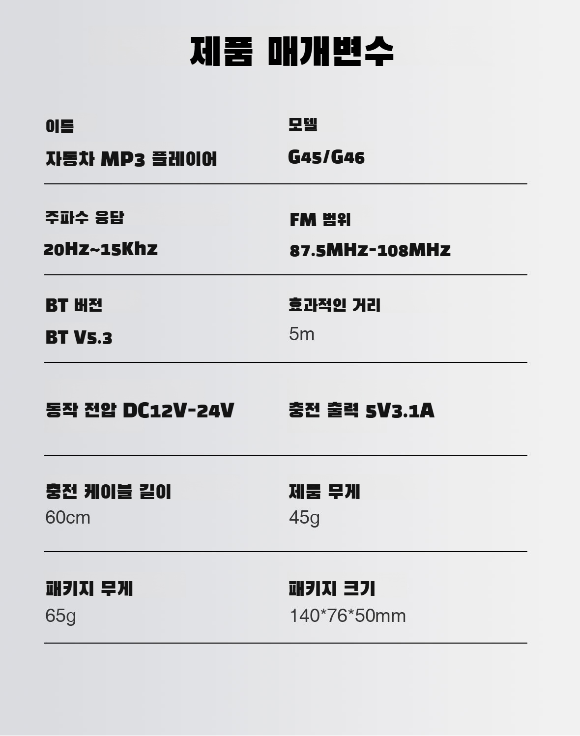 ● 차량 내에서 블루투스 기능으로 무선으로 음악 감상 및 핸즈프리 통화가 가능하여 운전 중에도 안전하게 사용하실 수 있습니다. ● MP3 재생은 물론, 충전 케이블이 함께 포함되어 있어 장시간 운전 시에도 스마트 기기 충전과 음악 감상을 동시에 즐길 수 있습니다. ● 간편한 설치와 사용법으로 별도의 복잡한 설정 없이 누구나 쉽게 차량의 오디오 시스템을 업그레이드할 수 있습니다. ● 다양한 기기와 호환이 가능하여 스마트폰, 태블릿 등 여러 장치에서 자유롭게 사용할 수 있는 실용적인 차량용 액세서리입니다. ● 고음질 오디오 전송을 지원하여 깨끗하고 생생한 사운드로 드라이브의 즐거움을 한층 더 높여줍니다.